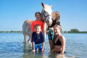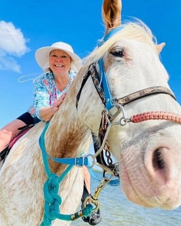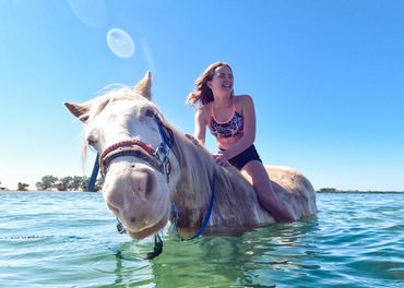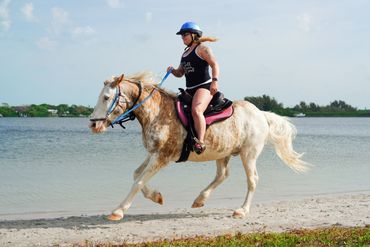 Rowdy, A.K.A Rowdy Piper, is a white and cream draft quarter horse cross. He is a kind hearted beach horse who loves everyone. His favorite thing to do is to sing to his rider in the water. He makes loud humming noises that can sound anything from dog to an engine. He will do anything he is asked to do because of his love for working. Besides singing, he loves to canter down the beach with our advanced riders. He does a little leap of joy before he takes off because he loves to go fast. He also has a more relaxed side for our more nervous customers and kids. He takes care of every type of rider, and he is one of the guide favorites!